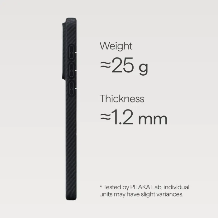 Ultra-thin aramid fiber case delivers the purest expression of PITAKA’s iconic Classic design philosophy. World's first Aaron button with NFC Signature aerospace-grade aramid fiber Ultra-thin, ultra-light profile MagSafe & wireless charging compatible Everyday protection you can trust Thickness: 1.
